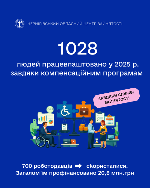 У 2025 році завдяки програмам компенсацій за працевлаштування роботу отримали 1028 громадян області. Компенсаційними програмами від служби зайнятості скористалися 700 роботодавців. … Читати далі Діють компенсації за працевлаштування