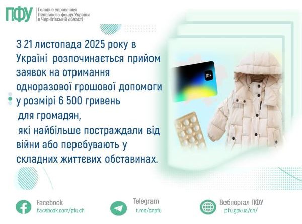Читати даліЗ 21 листопада 2025 року в Україні розпочинається прийом заявок на отримання одноразової грошової допомоги у розмірі 6 500 гривень