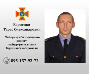 У Городнянській територіальній громаді уже як місяць стартував проєкт МВС “Офіцер-рятувальник громади”. Офіцером-рятувальником Городнянської територіальної громади є: КАРПЕНКО Тарас Олександрович – майор служби цивільного захисту;