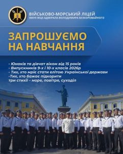 Військово-морський ліцей імені віце-адмірала Володимира Безкоровайного (м. Одеса) оголошує набір та запрошує юнаків і дівчат після 9 класу здобути якісну освіту й підготуватися до служби у Збройних Силах України.